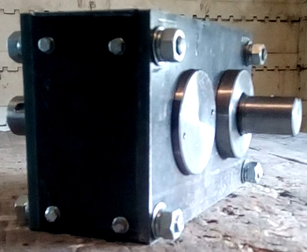 Механизм делительный для тестоделителя «Кузбасс 68-2М» до 2008 г.в. («второй редуктор»). Преобразует непрерывное вращение входного вала в прерывистое вращение выходного вала.